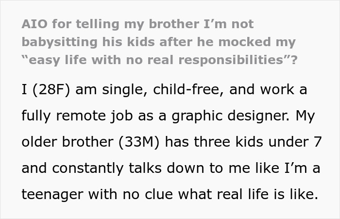 In today’s story, we step into a sibling conflict that has rocked the life of the 28-year-old original poster (OP), who is a child-free, single graphic designer. She has an obnoxious 33-year-old brother who is the father of 3 kids and thinks that he knows what real life is like. In fact, he keeps treating our lady like a stupid teenager and just loves to mock her career.