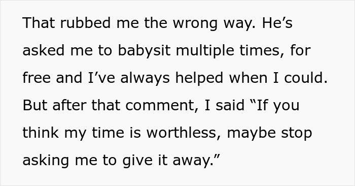 Recently, he overstepped when he joked about OP, claiming that it “must be nice to sleep in and waste your money on coffee and takeout.” Is this man for real? The poster laughed that off until he said that she should watch his kids sometimes so that she knows what “real responsibility” is. This really triggered OP because she has been a free babysitter for him many times.