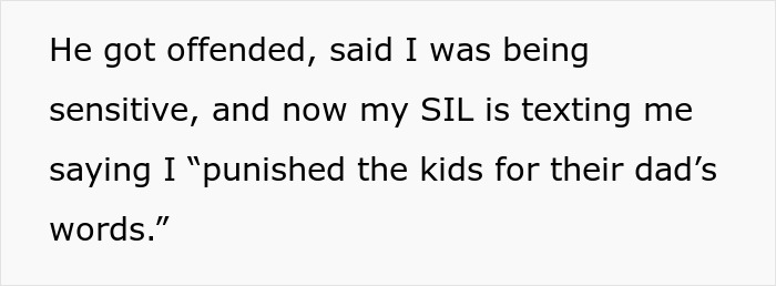 Sick of his mocking, she refused, but her sister-in-law said that she was punishing the kids for his words