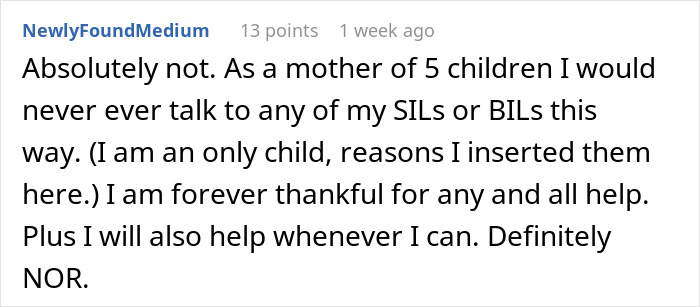 She finally put her foot down and said that if he thinks her time is so worthless, then he should stop asking for it. On cue, drama quickly unraveled as he called her “sensitive” and her sister-in-law accused OP of “punishing the kids for his words.” However, our poster refuses to budge until he shows her some respect. Well, good for her for standing up to the big bully!